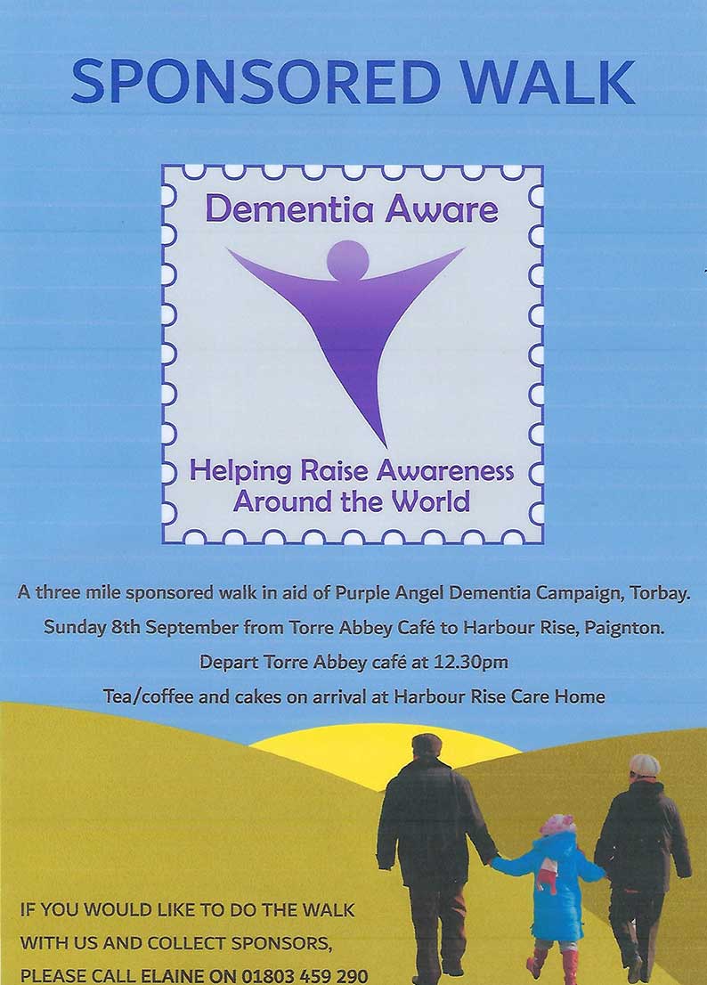 Please join us on Sunday to walk from Torre Abbey Café leaving at 12:30 back to Harbour Rise to raise awareness of Dementia and support Purple Angel. We will welcome you back with refreshments and cakes. It is a wonderful walk, and a wonderful cause. Thanks for your support!