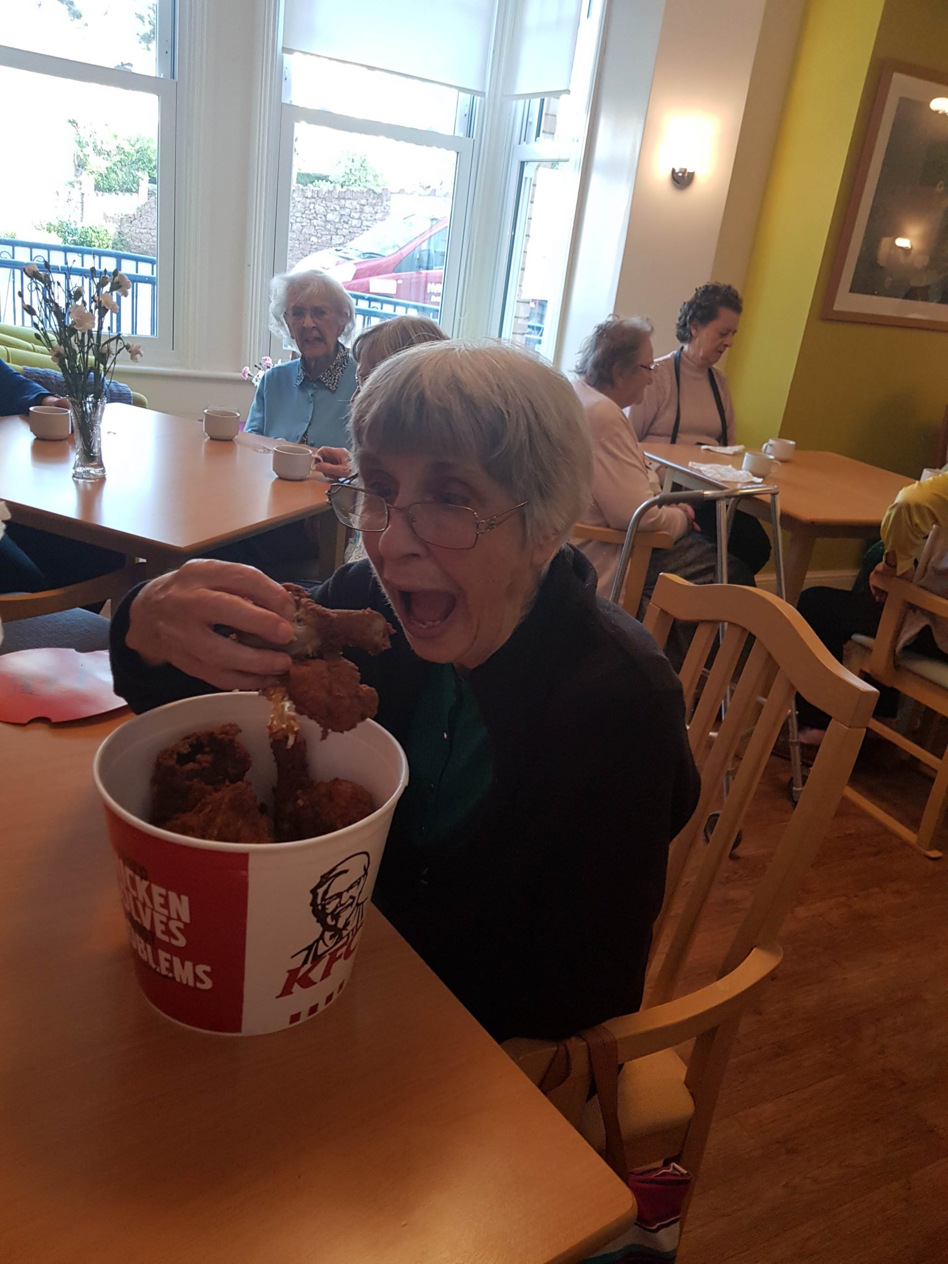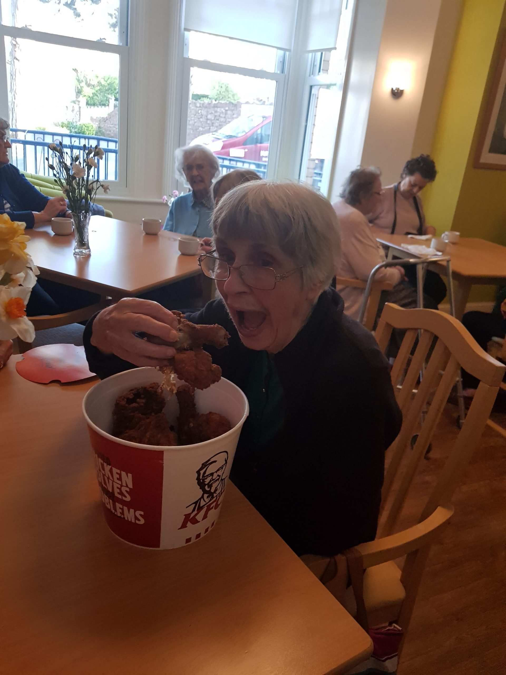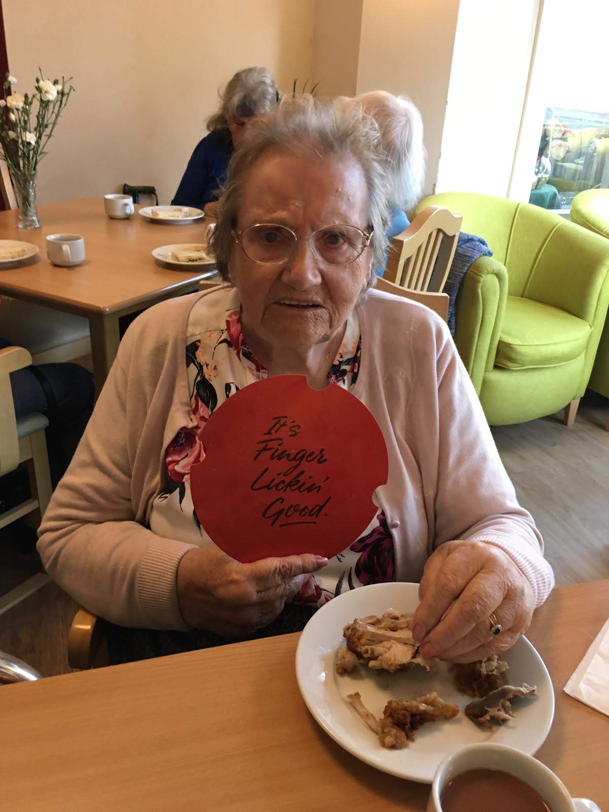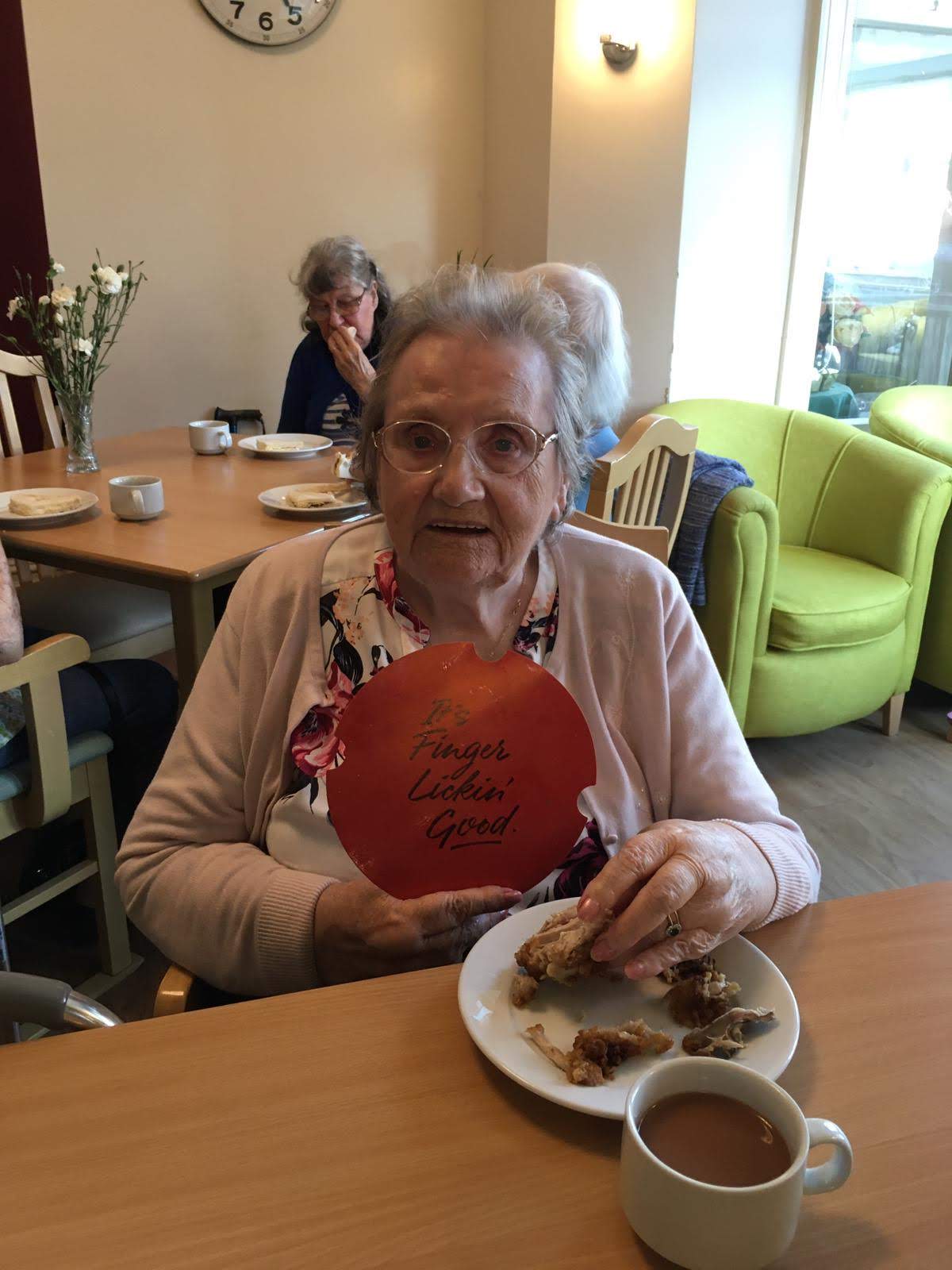 We received an unexpected call from KFC Tuesday afternoon to ask how many residents and staff we have and that they would like to donate us some chicken. Of course we said Yes. This was delivered to the door cooked and ready to eat. And as you can see by some of the residents faces they loved it and one resident kept saying that it was “finger licking good”. Another told me that she had never had this before, dived in and went back for seconds. It was a real treat. And some are still talking about how lovely it was now.