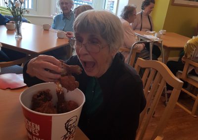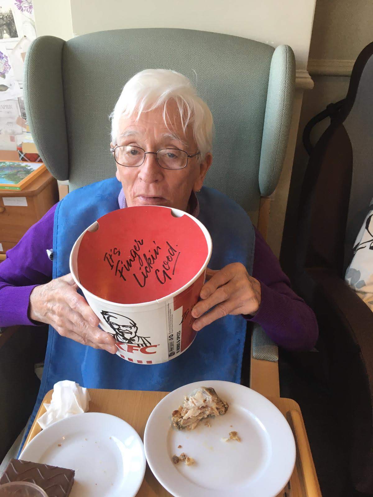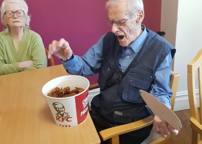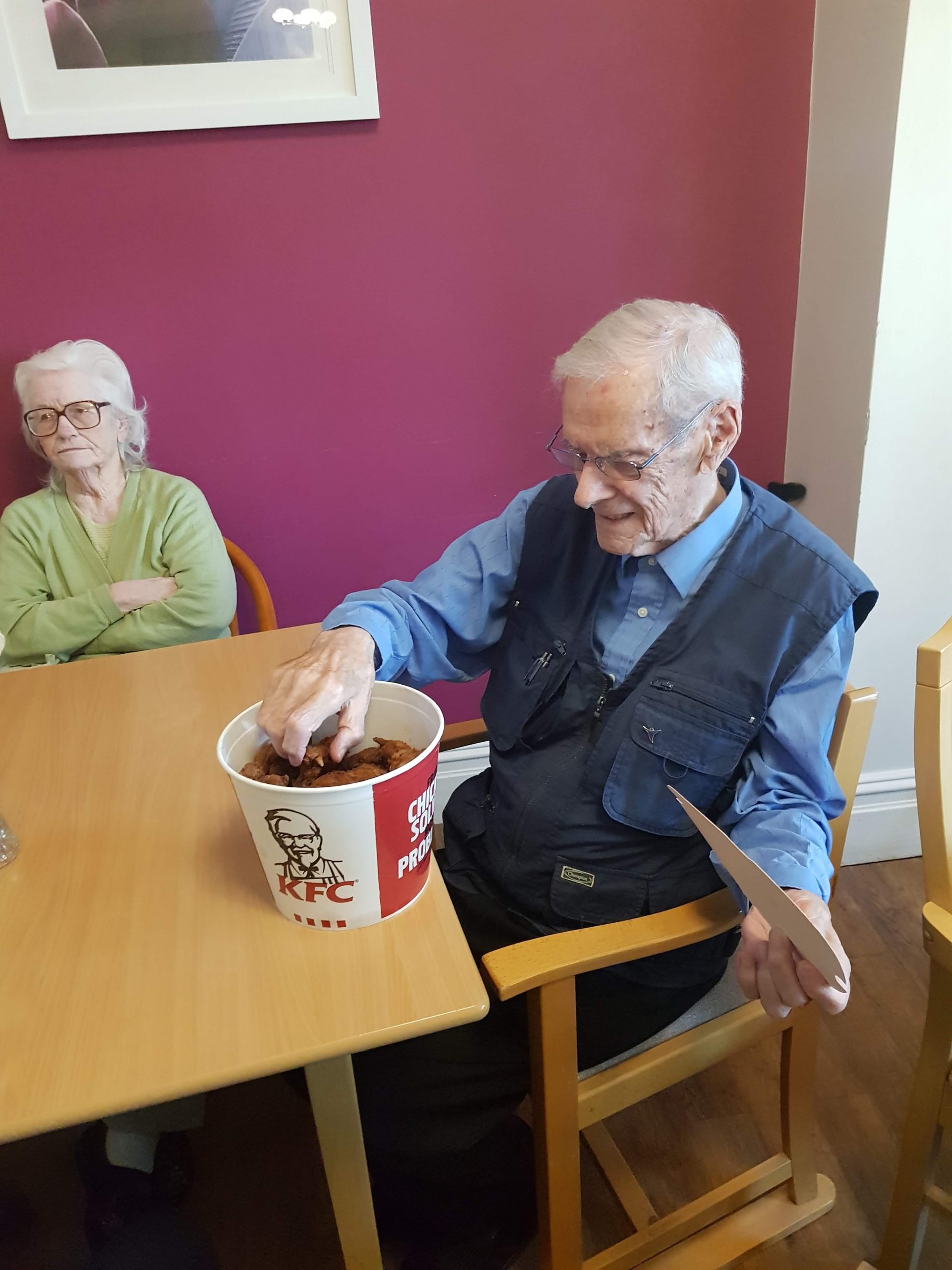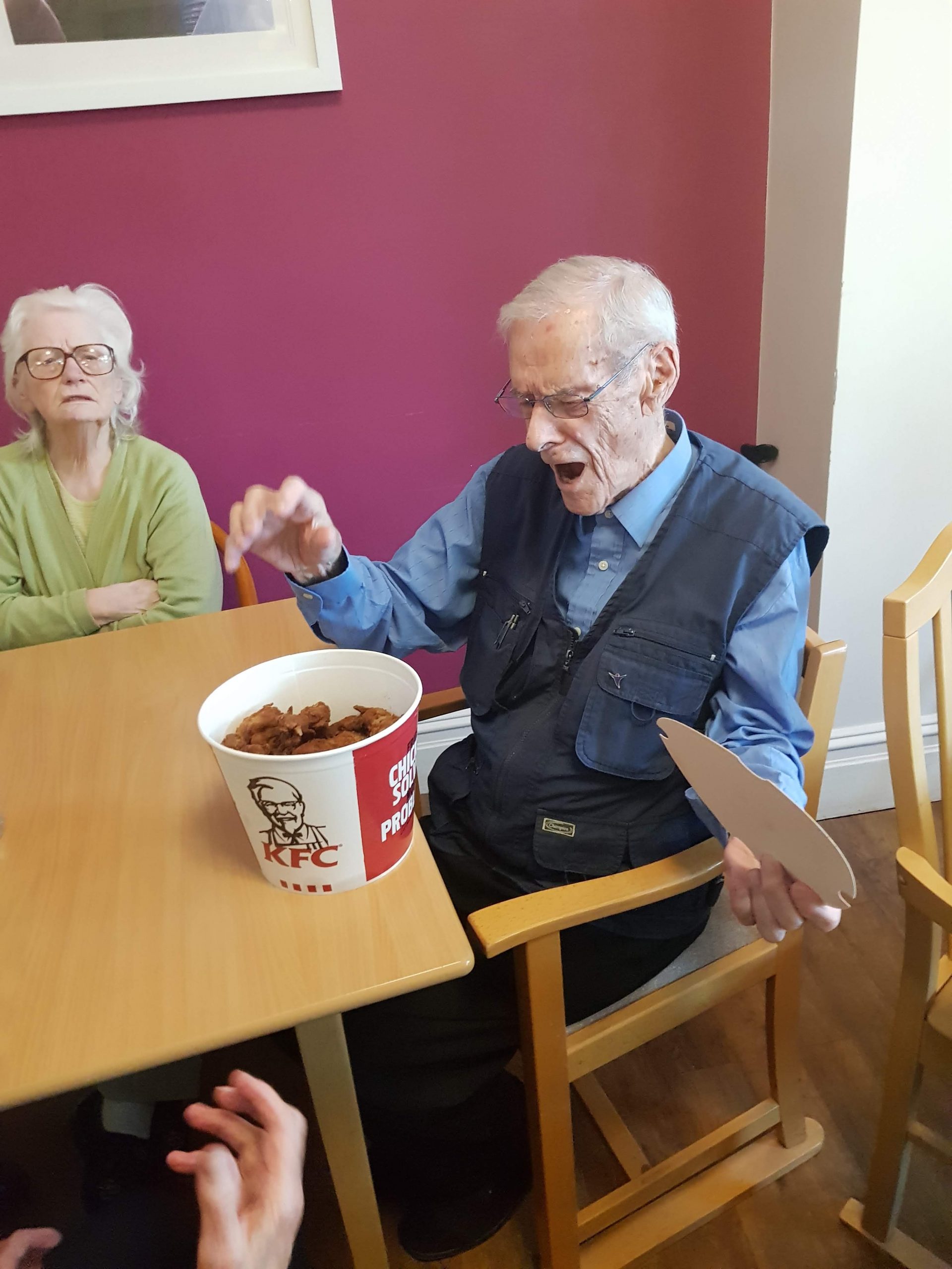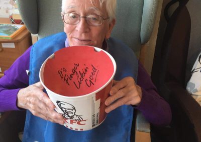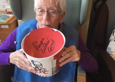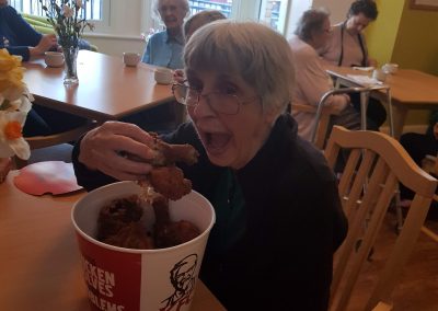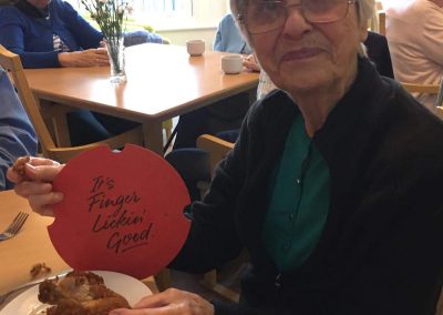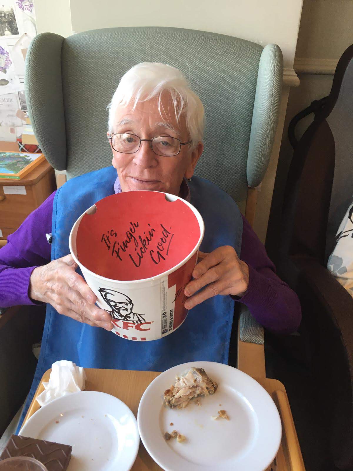 We received an unexpected call from KFC Tuesday afternoon to ask how many residents and staff we have and that they would like to donate us some chicken. Of course we said Yes. This was delivered to the door cooked and ready to eat. And as you can see by some of the residents faces they loved it and one resident kept saying that it was “finger licking good”. Another told me that she had never had this before, dived in and went back for seconds. It was a real treat. And some are still talking about how lovely it was now.