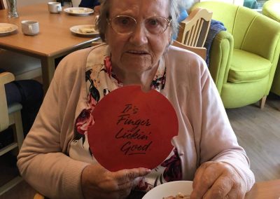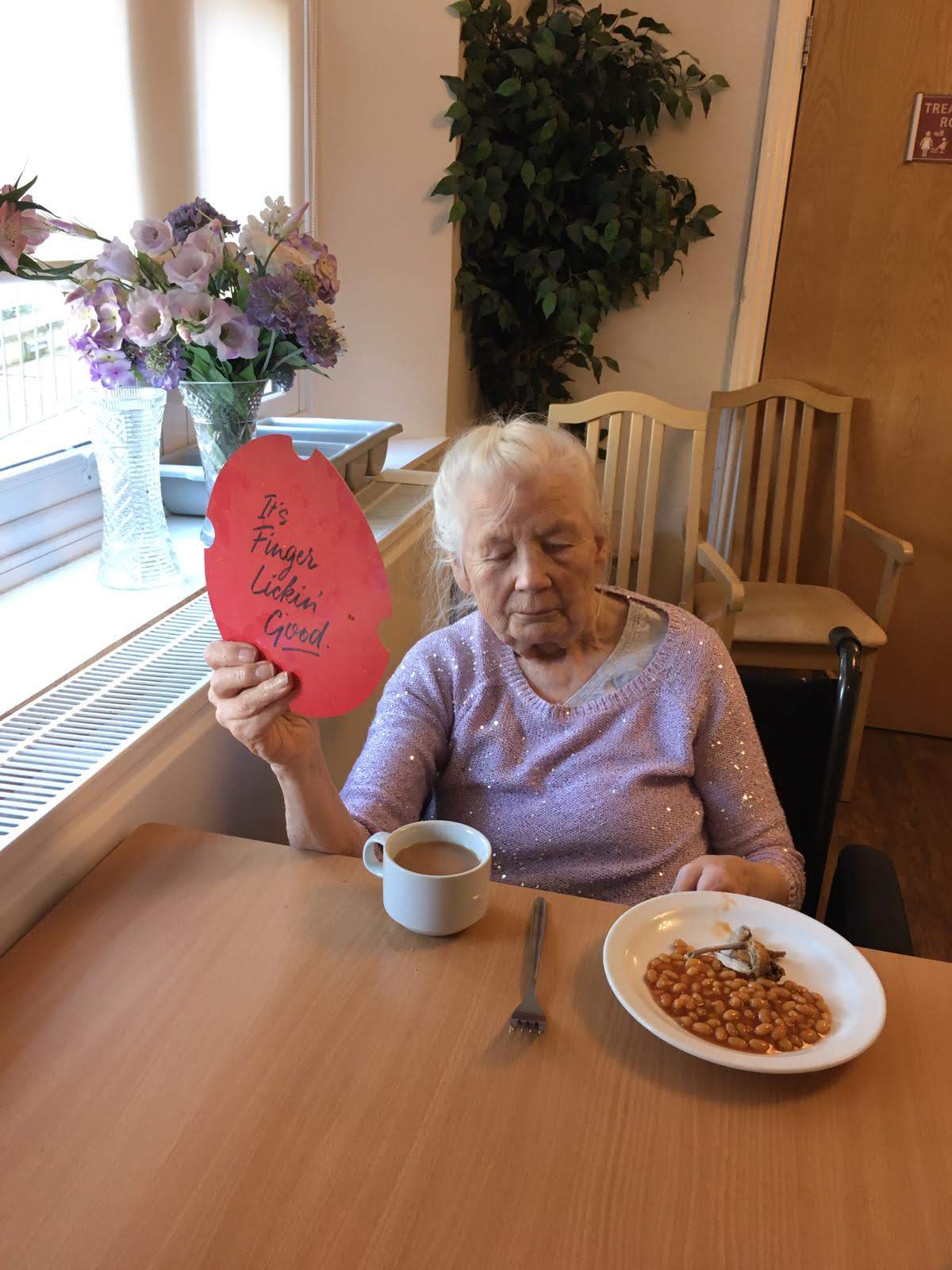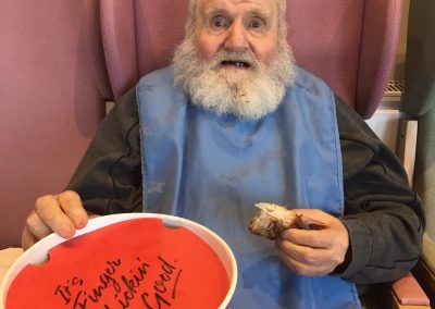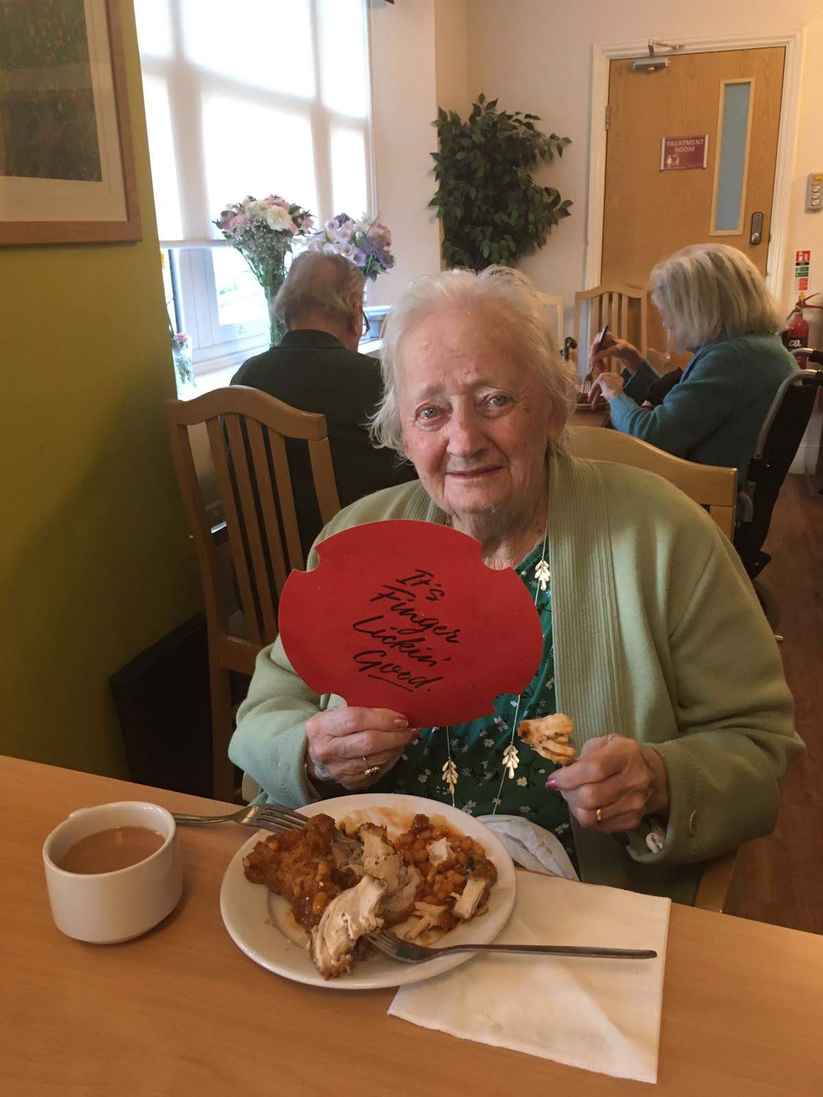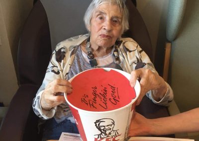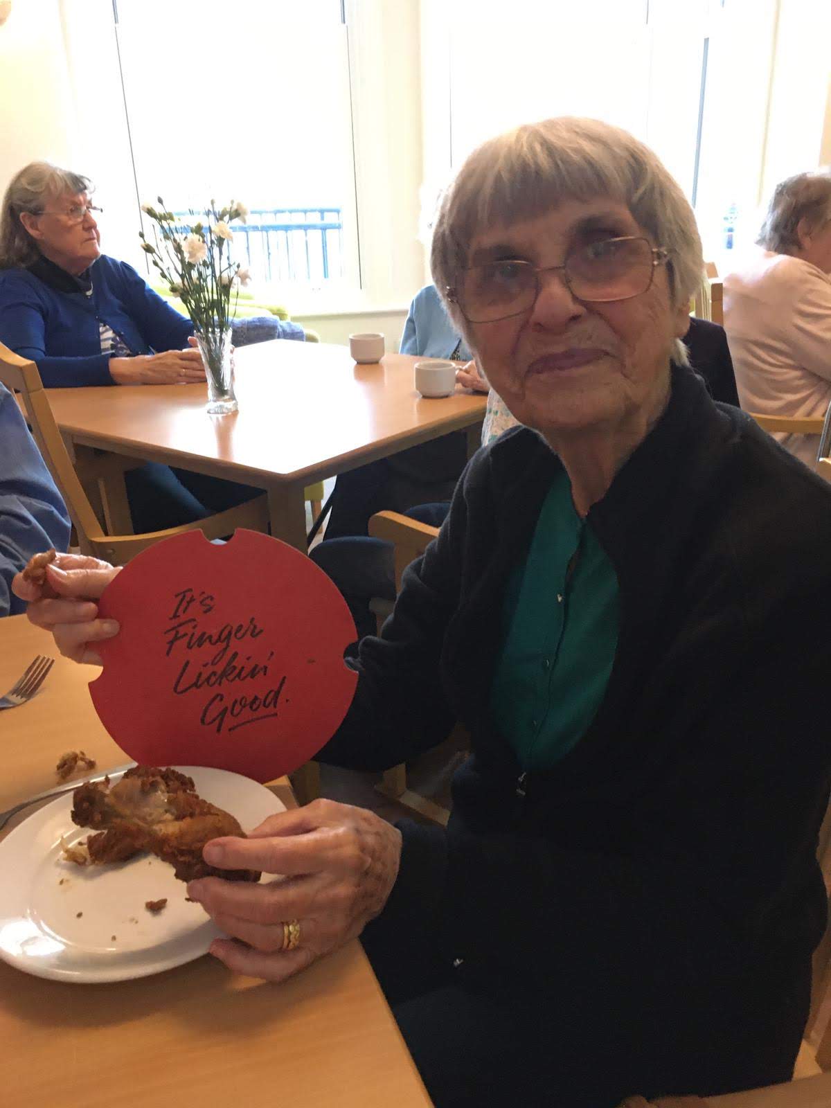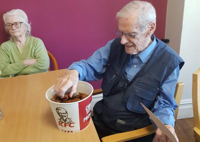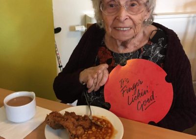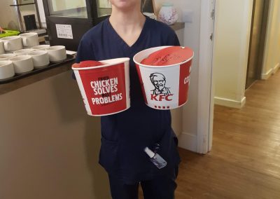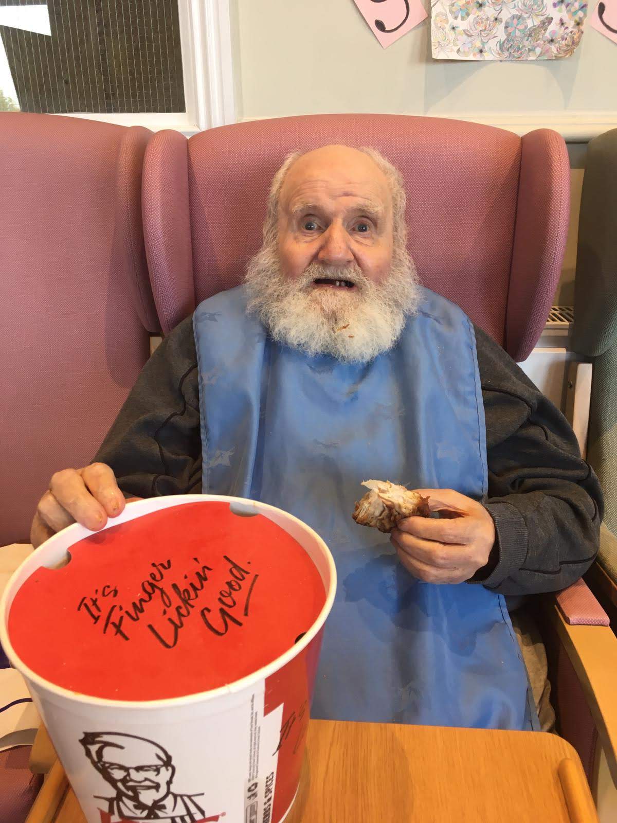 We received an unexpected call from KFC Tuesday afternoon to ask how many residents and staff we have and that they would like to donate us some chicken. Of course we said Yes. This was delivered to the door cooked and ready to eat. And as you can see by some of the residents faces they loved it and one resident kept saying that it was “finger licking good”. Another told me that she had never had this before, dived in and went back for seconds. It was a real treat. And some are still talking about how lovely it was now.