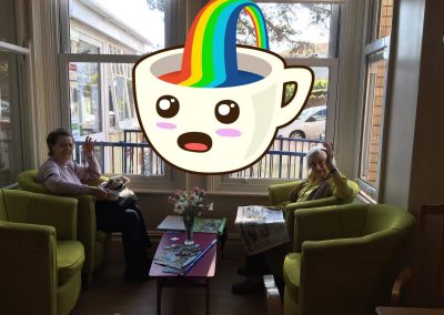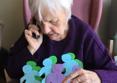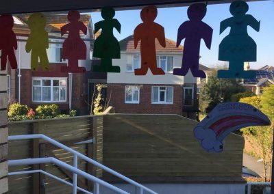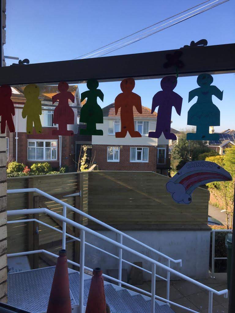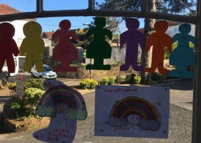 You may be aware that there is currently a “Believe in Rainbows” Trail, which encourages people to create a rainbow picture to display in your window so that children can go rainbow spotting whilst out on a daily walk near there homes. I was chatting to some of our residents and they said they would love to do this. After discussion I printed off some Rainbows to colour in and one lady said that we could cut out people shapes in different colours of the rainbow. These have been displayed in different windows of the home.