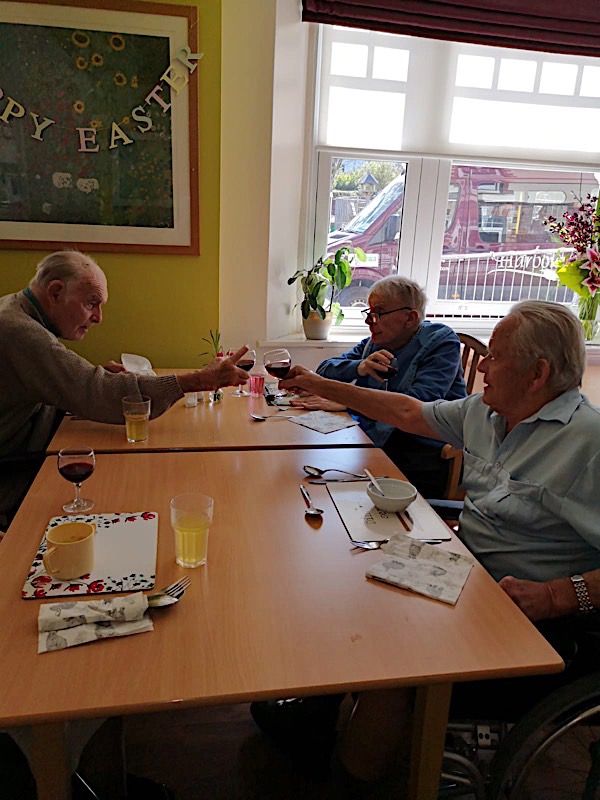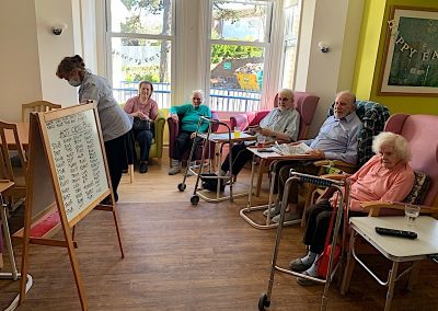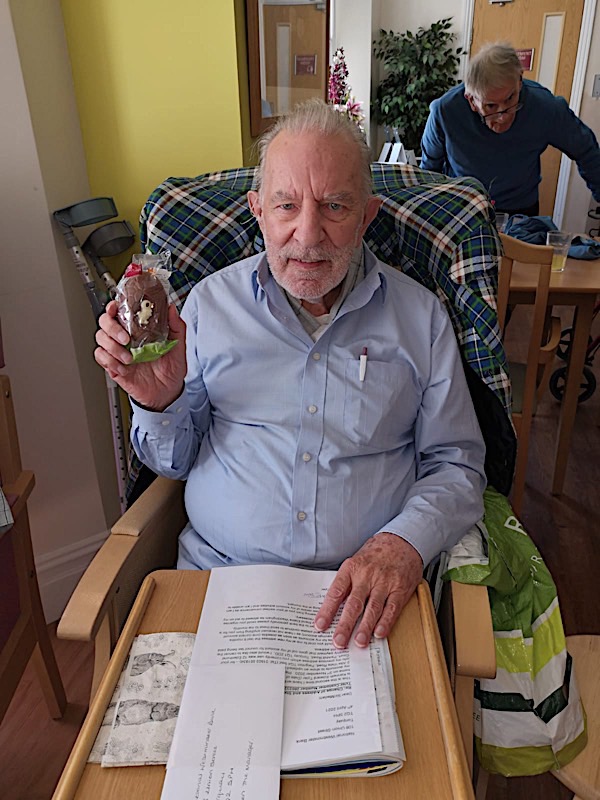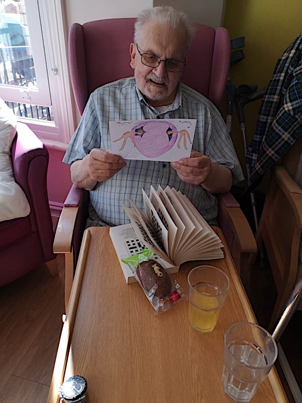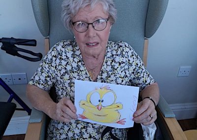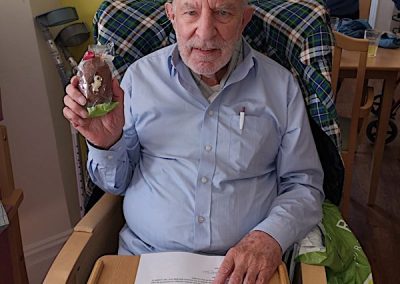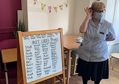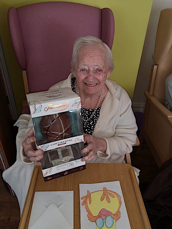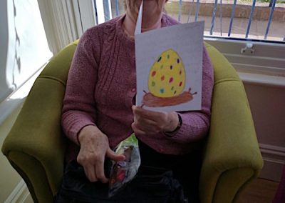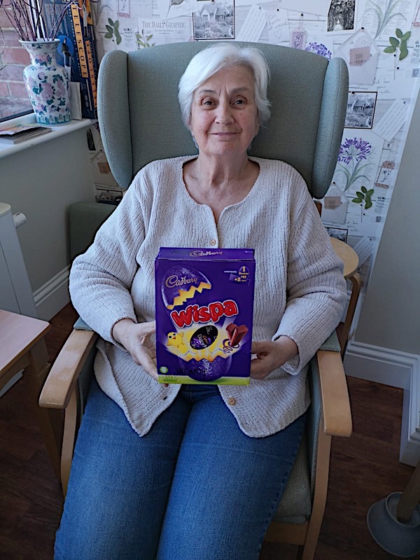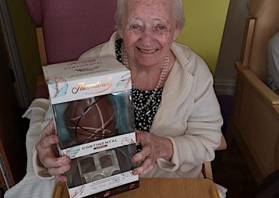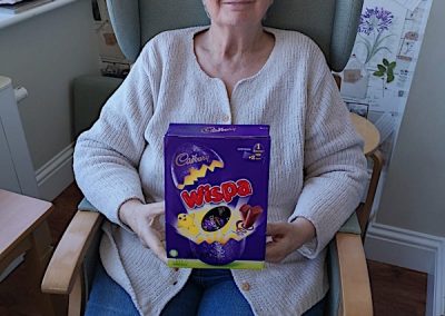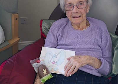 For Easter, we went the extra mile with non-alcoholic wine which went down like a dream, strawberries and cream, hot cross buns, many many chocolate eggs! Each resident was given either a chocolate Bunny or chocolate Egg from us. Joy regaled us with her infamous Easter Quiz.