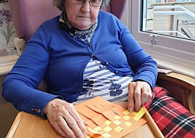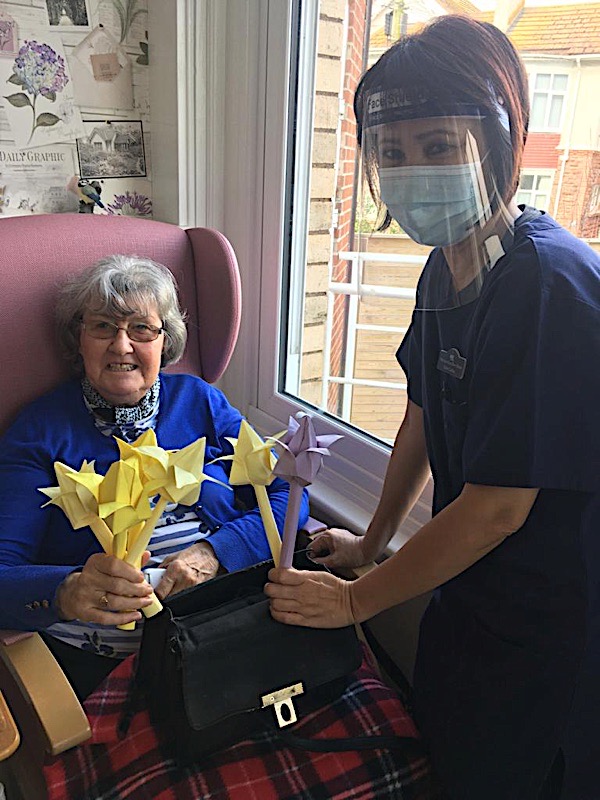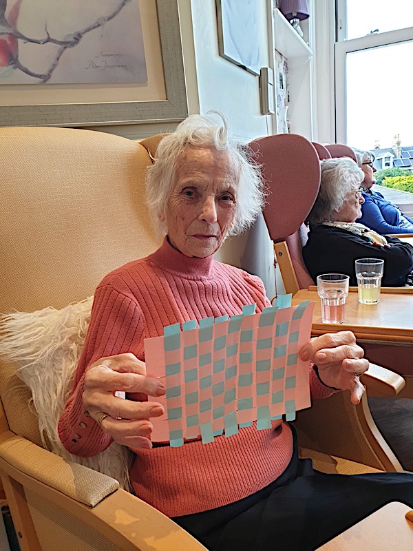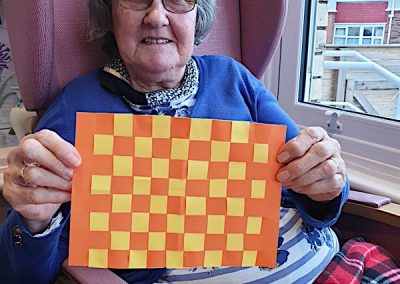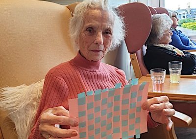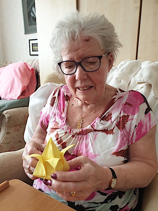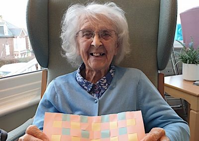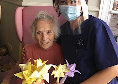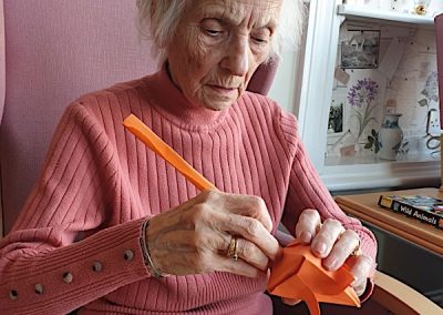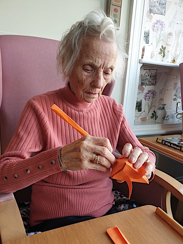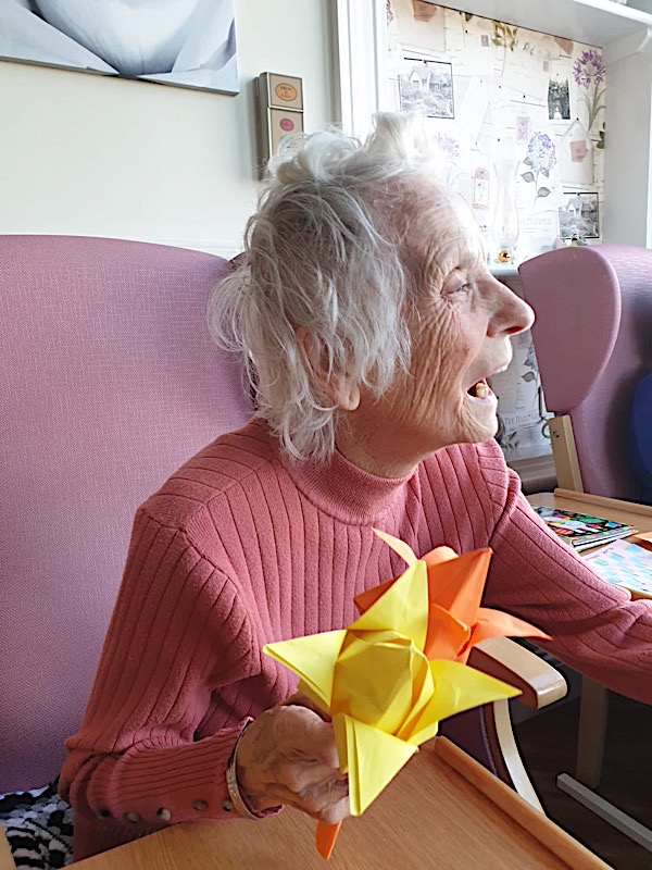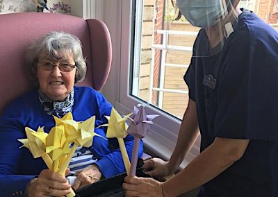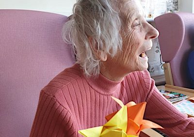 Our lounge assistants have had to work slightly differently while we are in outbreak as indeed there are a few activities we can not do at the moment. For instance: singing, anything that promotes sharing and touching the same object like a ball. So we are thrilled to see our residents have enjoyed ‘origami’ and making paper flower bouquets. This activity has also taken place in bedrooms too. Craft with origami and making valentine cards has certainly been one of the highlights of the week.