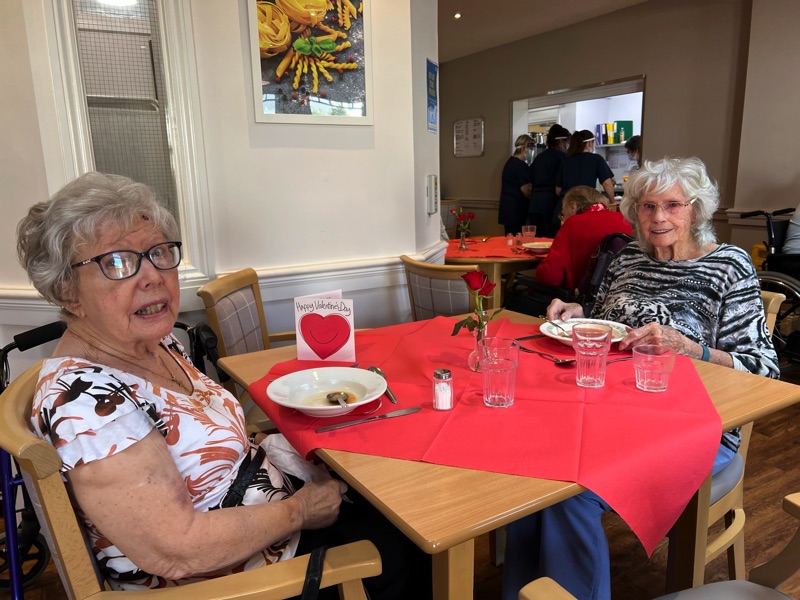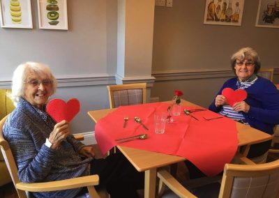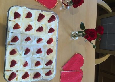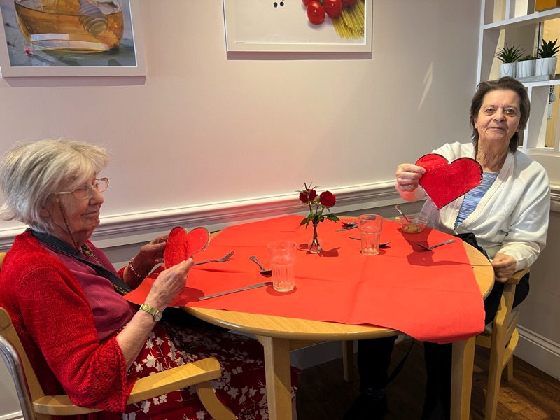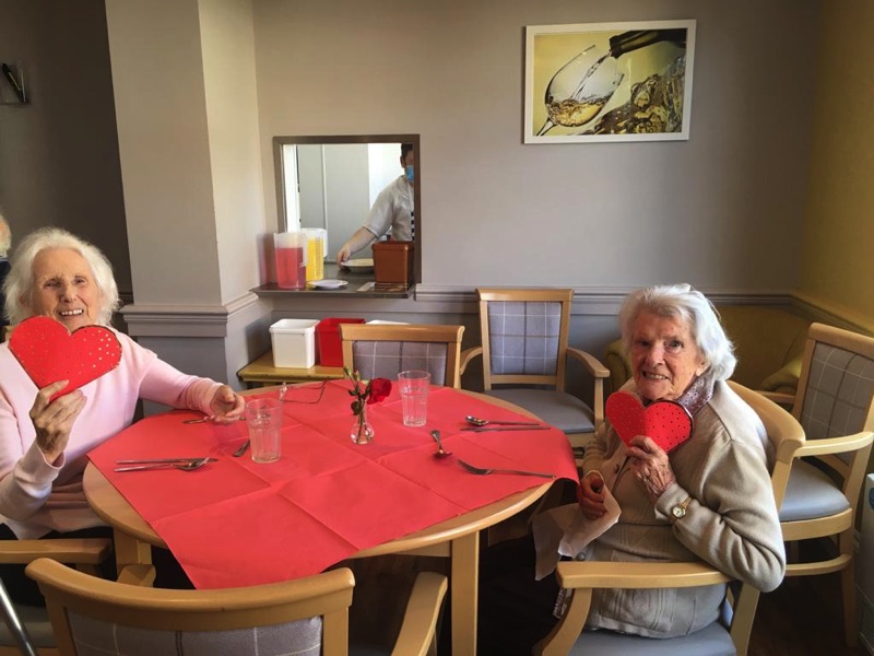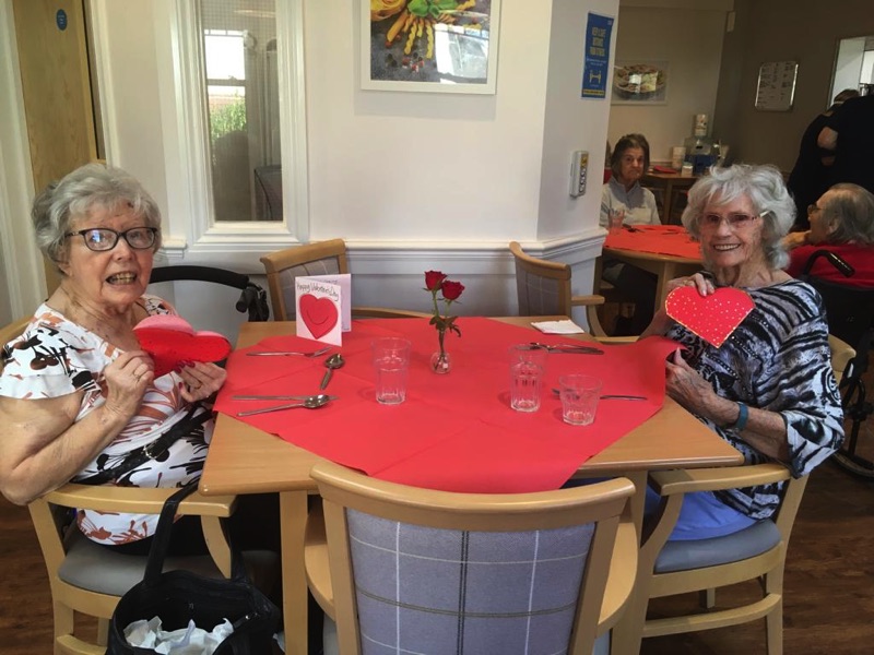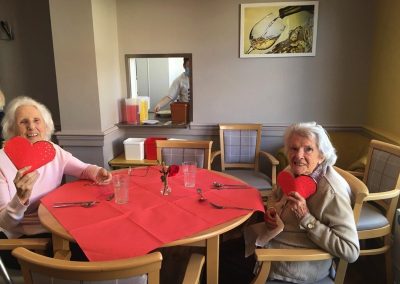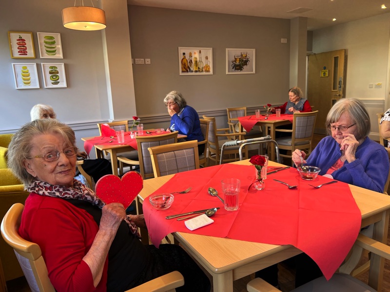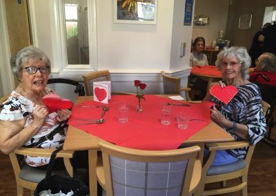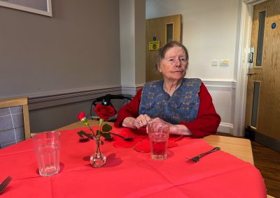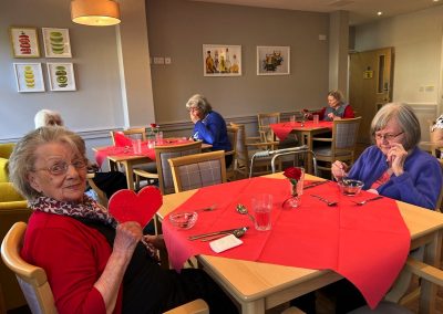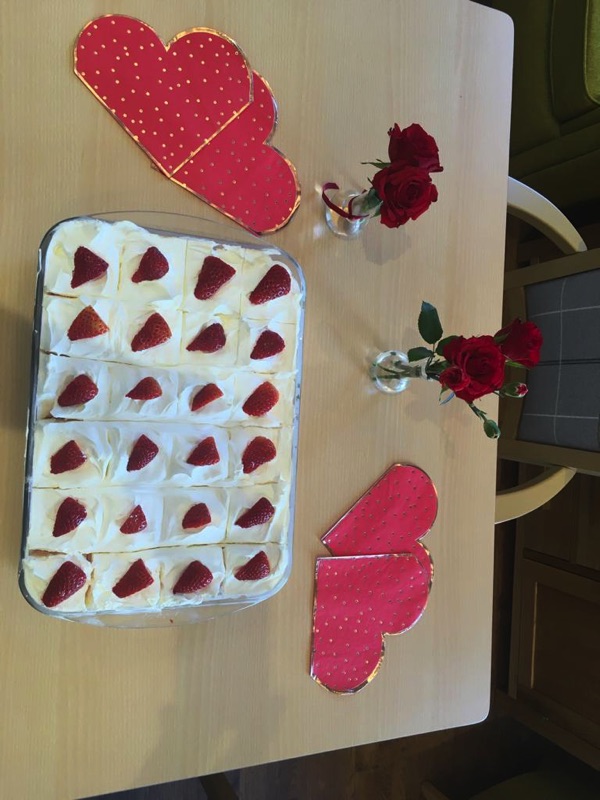This week, we celebrated Valentine in style and staff and relatives were prompted to wear red. Ian chose to wear a bow tie on his maintenance T-shirt, very sweet! One of our female residents received the most gorgeous bouquet of flowers and which made many members of staff very jealous. We enjoyed some Victoria sponge cake, pink shloer sparking drinks, home-made cupcakes with hearts on them. Home-made valentine cards were distributed too and all tables were decorated with red table clothes and heart shape napkins. We had lovely flowers scattered around the home. All together, it really felt that we did Valentine’s Day justice and it was really enjoyable by all.