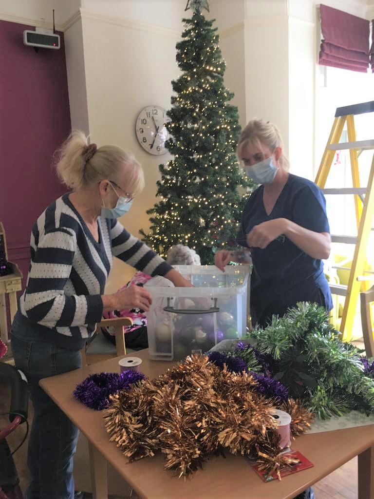 I must admit I had a few little Elves to make this happen. Elf Ian helped bringing all the decorations down from the attic ( there were quite a few!!), and Elf Zoe and Elf Christine have done an amazing job at putting the decorations up. So all together it has taken them 24 hours to put 6 Christmas trees up and decorations throughout!. The home looks beautiful and very festive, the residents really like it and they got involved in the decorating which is lovely and what we would encourage too.