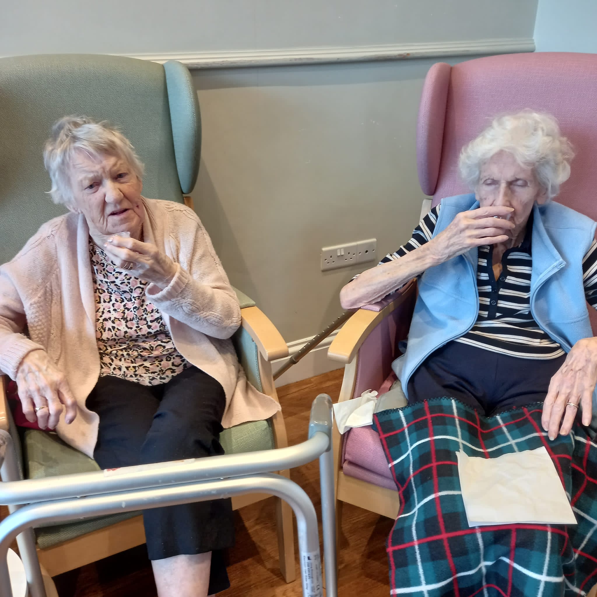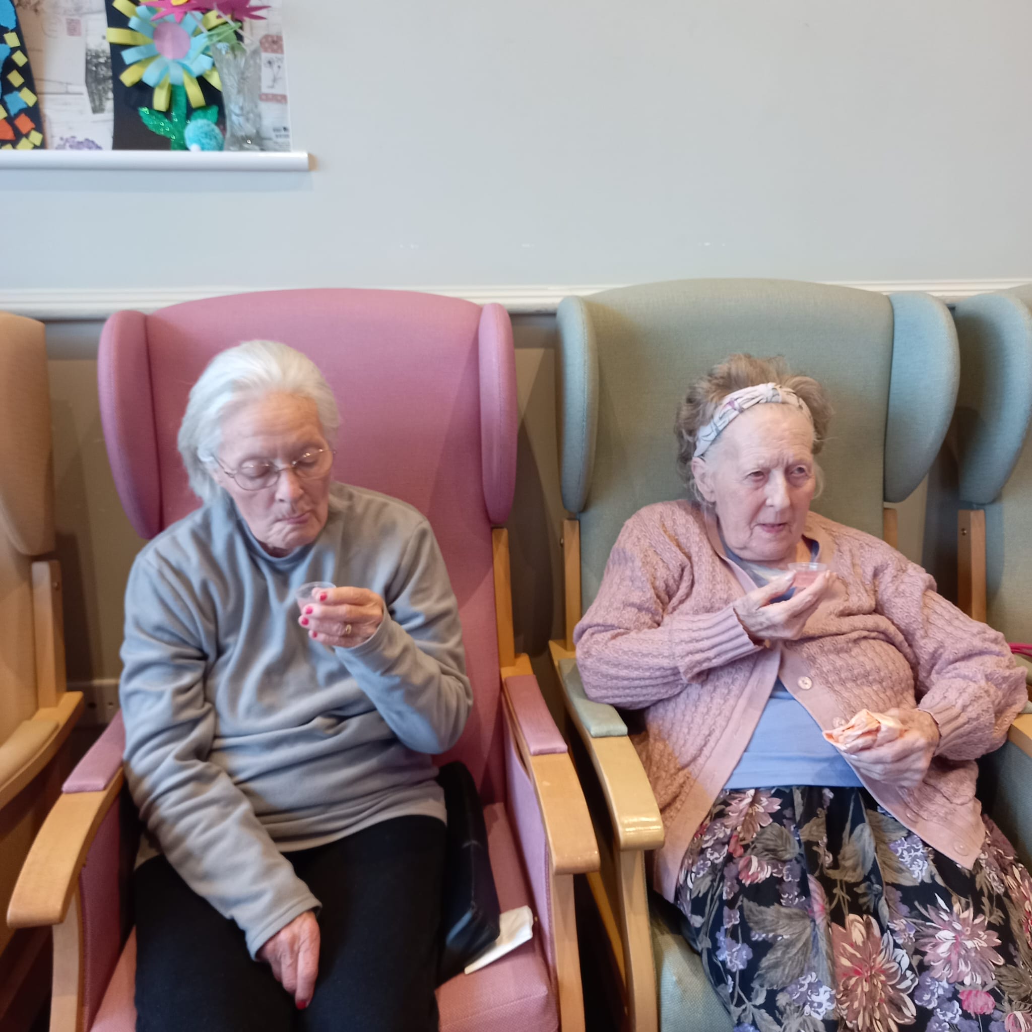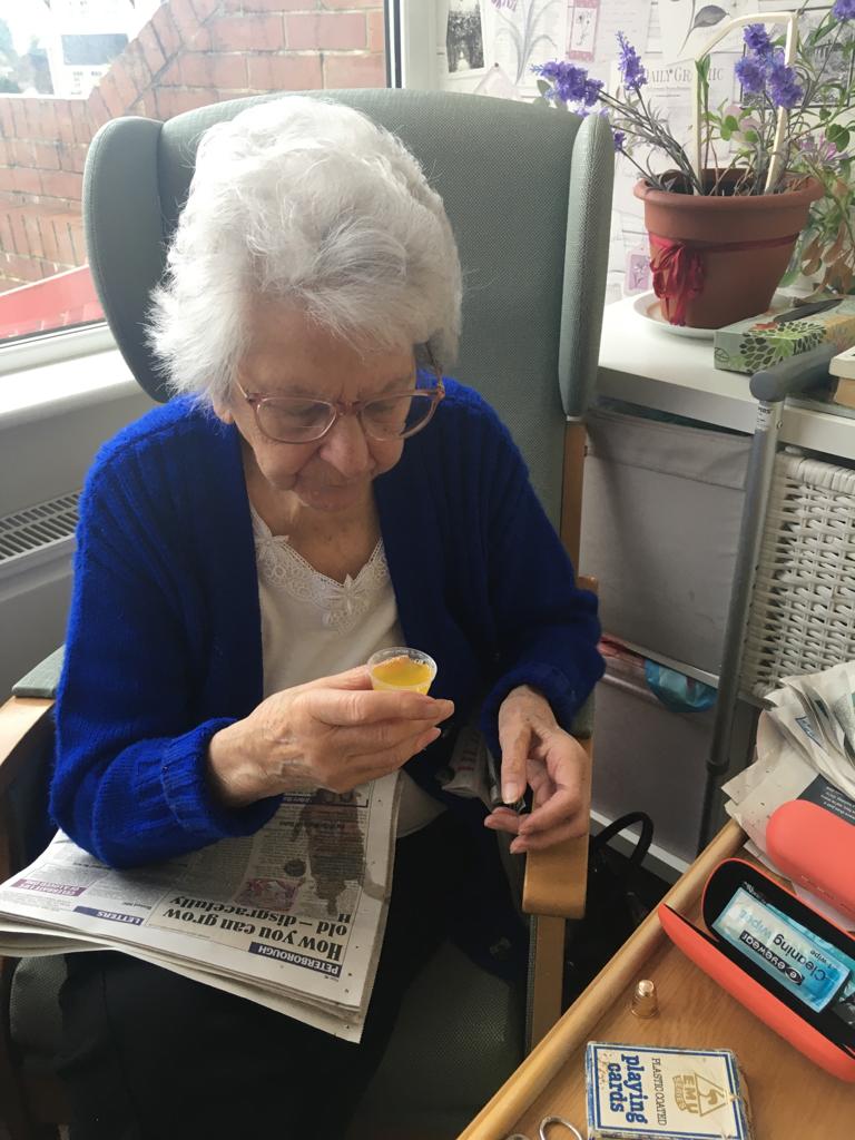 This week was nutrition week and we have been serving our residents a great selection of innovative drinks to assess whether we can stimulate their fluid intake. As we know, the link between good nutrition and wellbeing is not new – we all know that eating and drinking well are key to feeling well. You will notice in our photos that they are testing orange with pink lemonade – looked a bit zingy!! They also had pineapple which was their favourite with fizzy orange a close second.
