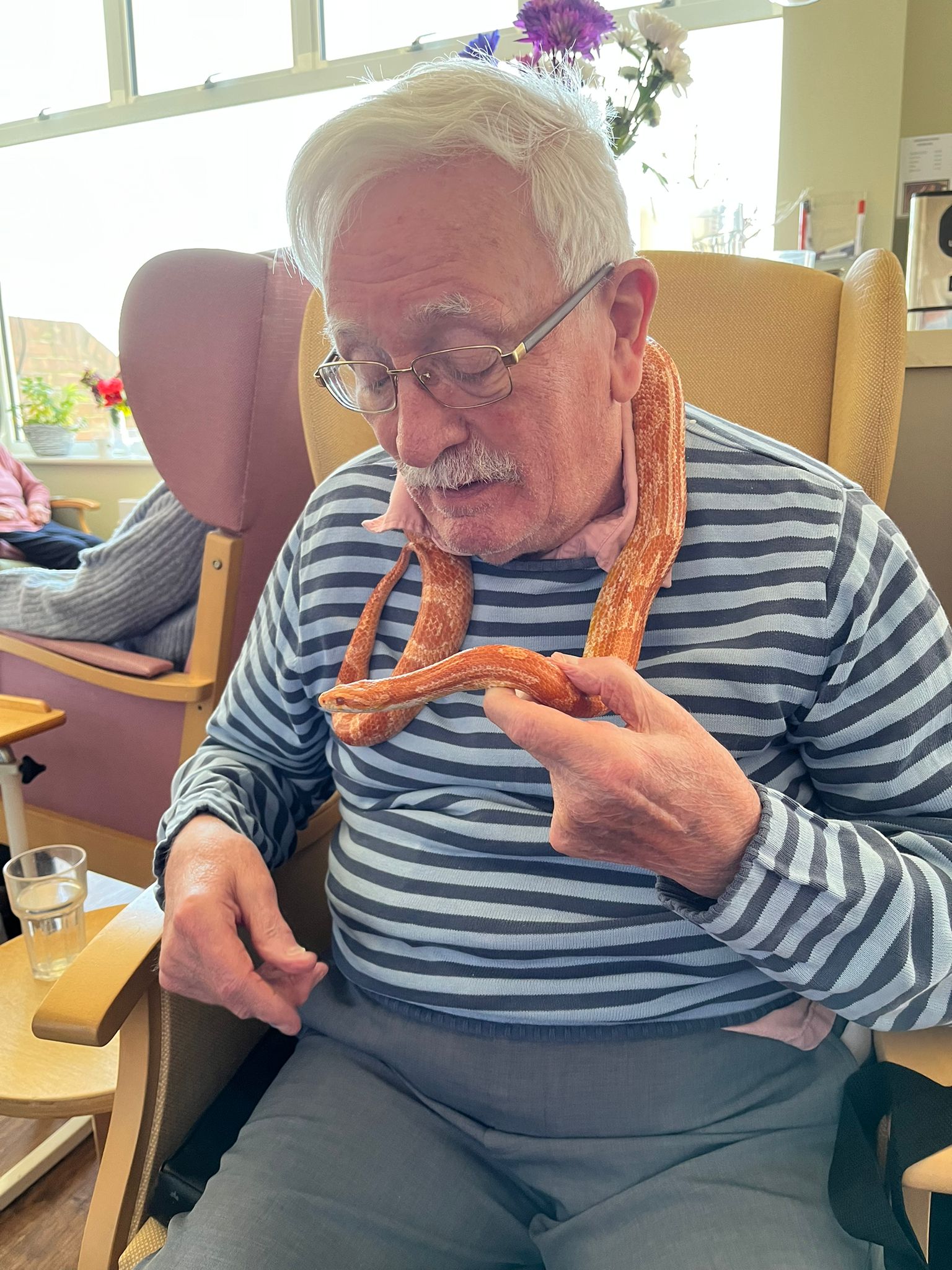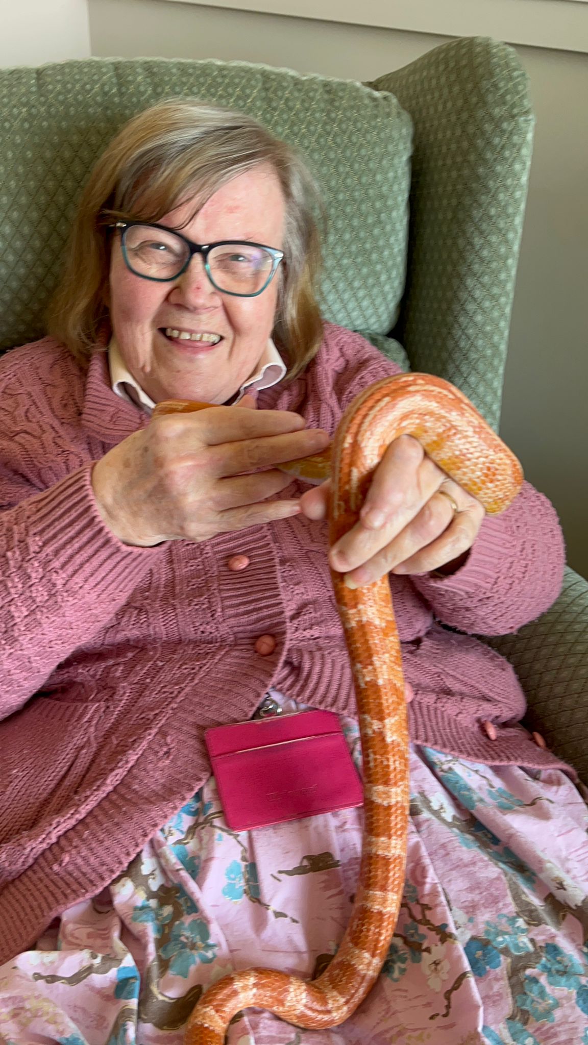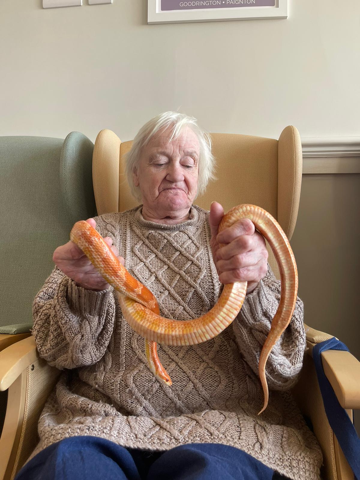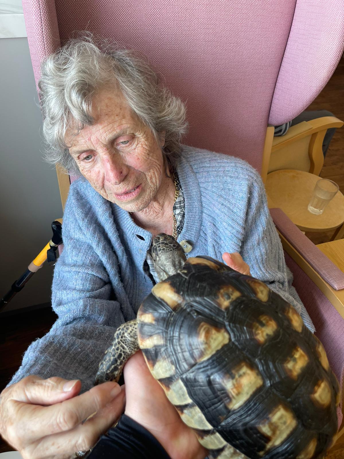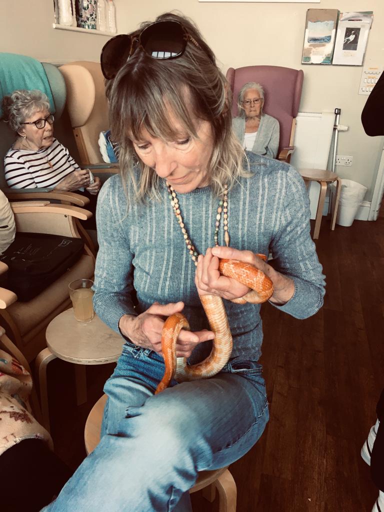 I will start with a bang and talk about the amazing visit we had with the animals on Wednesday. You might have seen some photos already? We had it all: dogs, snakes, tortoise, chihuahua, rabbits, bearded dragon and the rest!! The lovely pets brought so much fun, excitement and love to our lovely residents who could not stop laughing. Even our members of staff joined it – what a fabulous afternoon it was and we will book them again within the month! The lovely touch was that some of the pets were able to visit our residents in their room.
