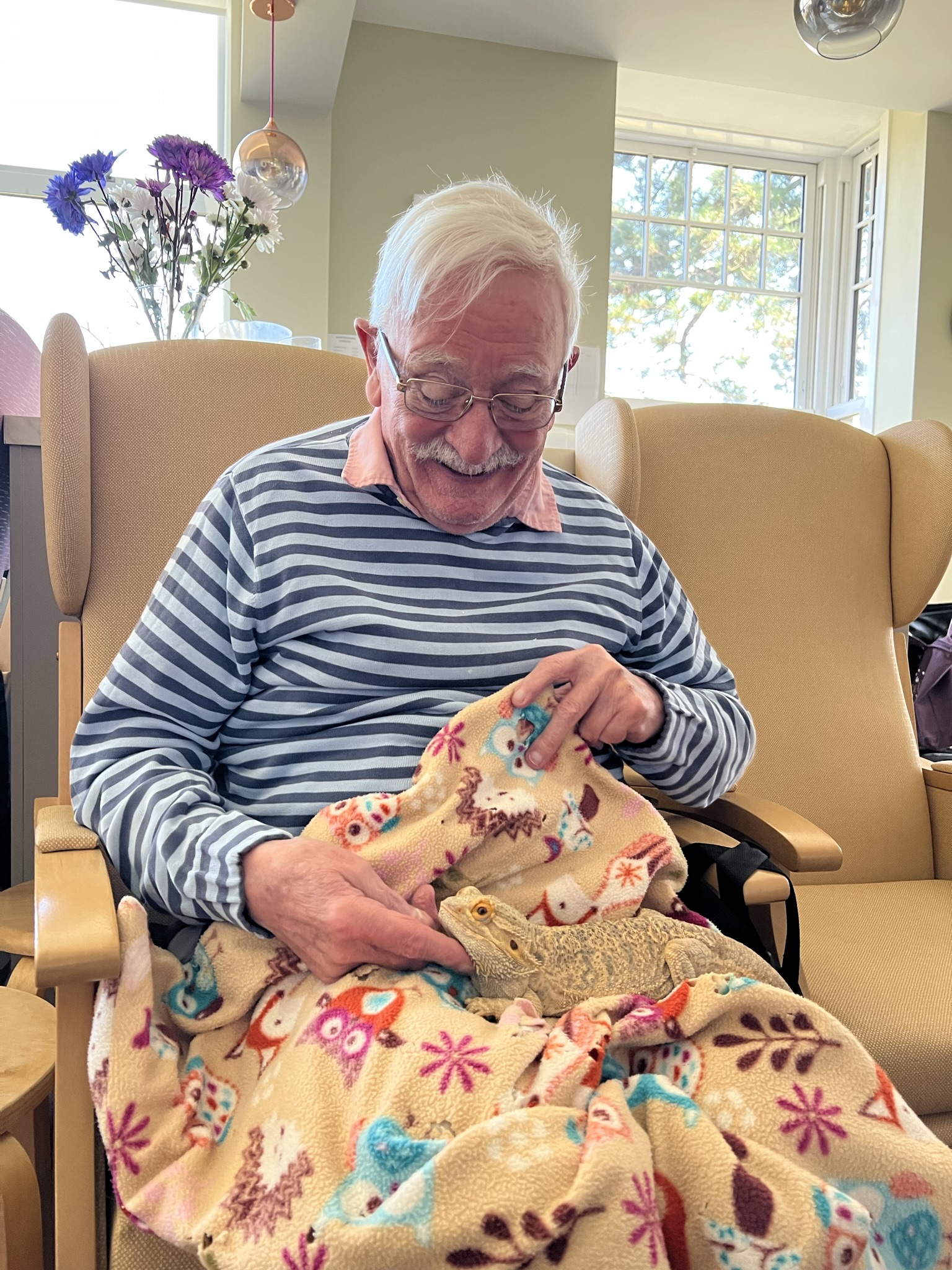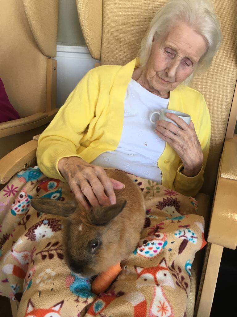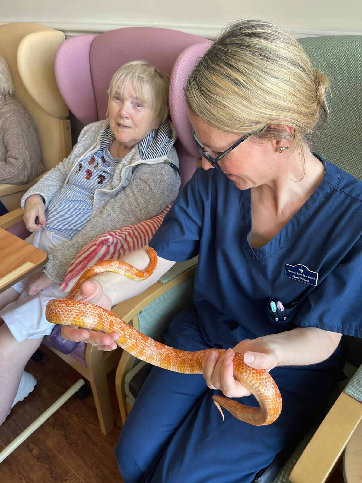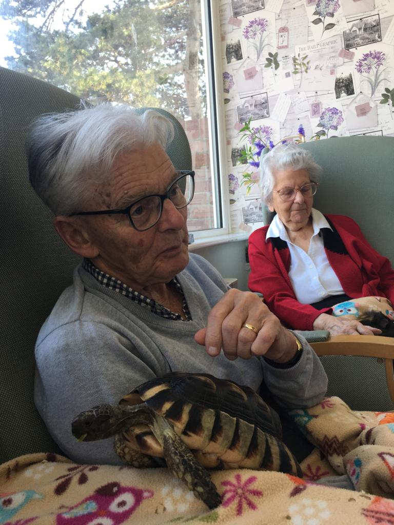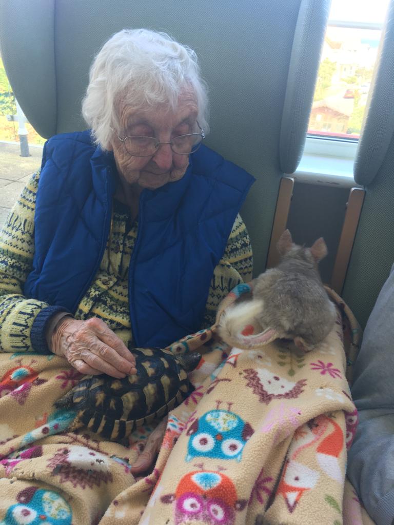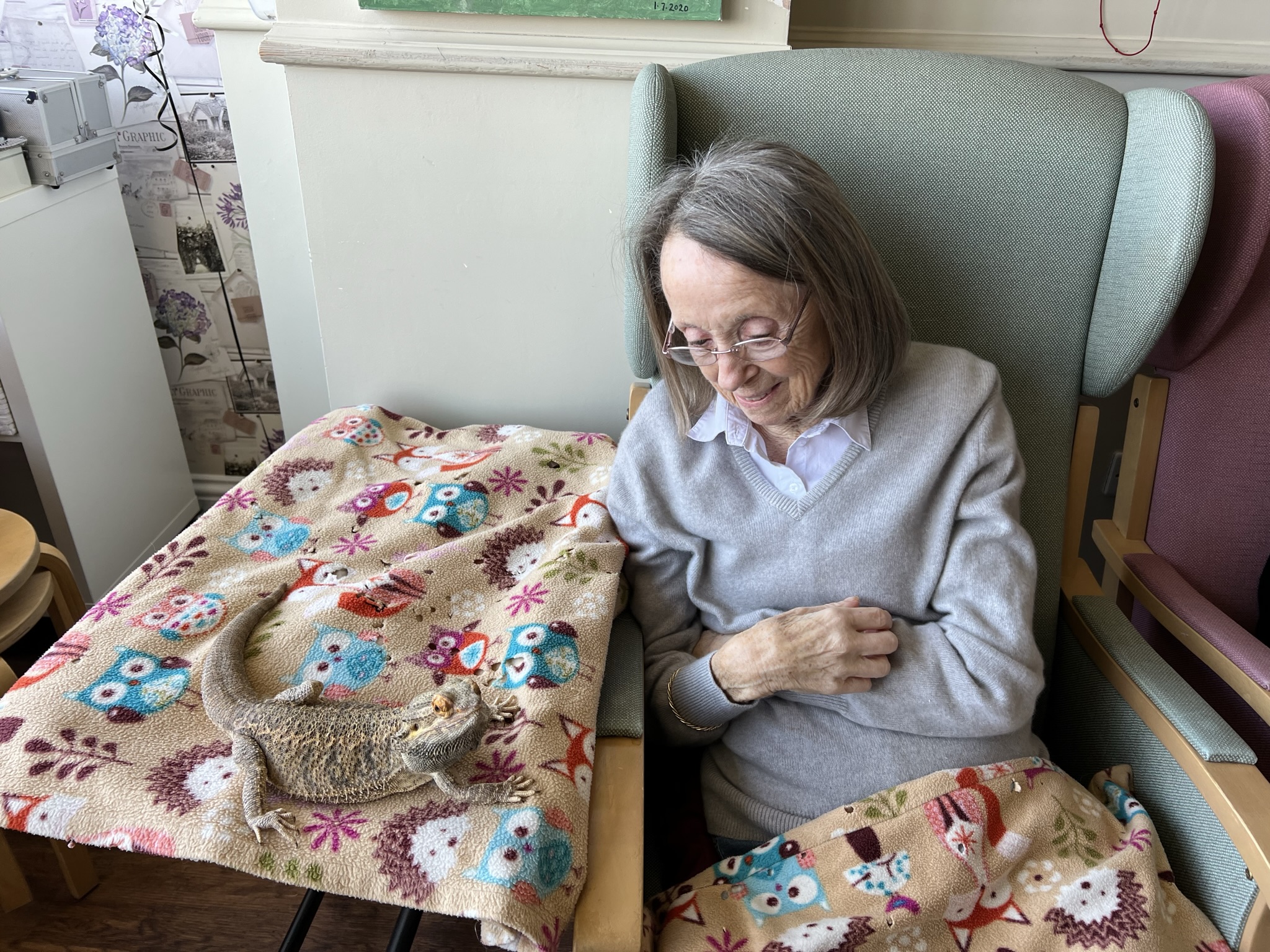 I will start with a bang and talk about the amazing visit we had with the animals on Wednesday. You might have seen some photos already? We had it all: dogs, snakes, tortoise, chihuahua, rabbits, bearded dragon and the rest!! The lovely pets brought so much fun, excitement and love to our lovely residents who could not stop laughing. Even our members of staff joined it – what a fabulous afternoon it was and we will book them again within the month! The lovely touch was that some of the pets were able to visit our residents in their room.