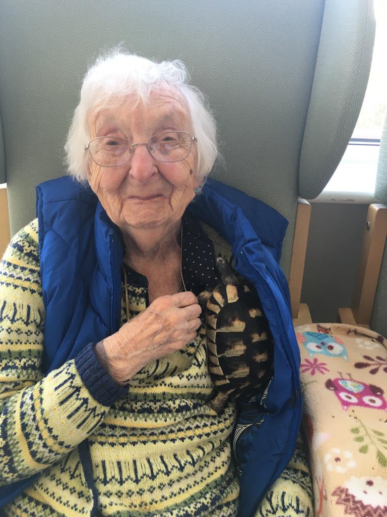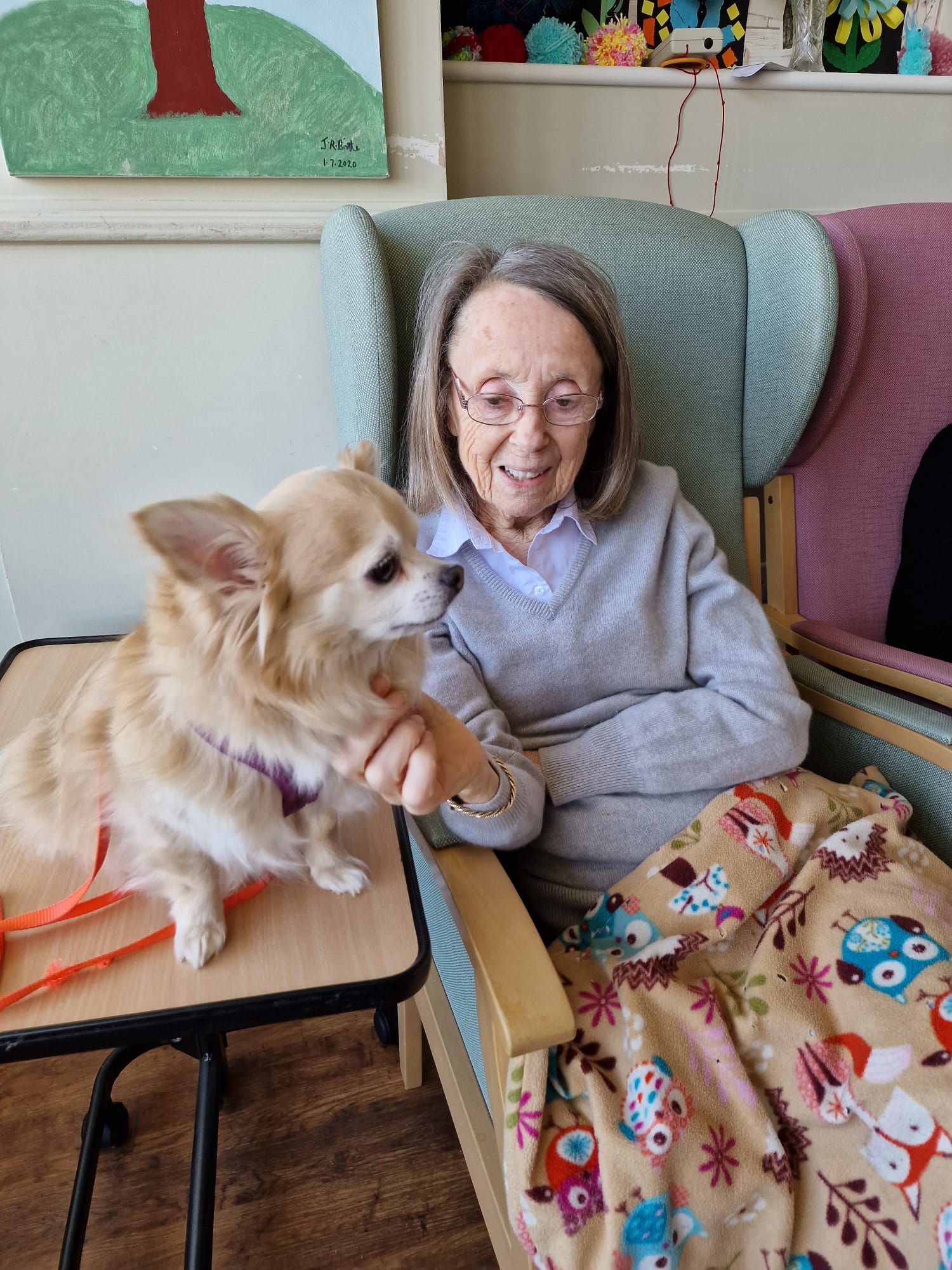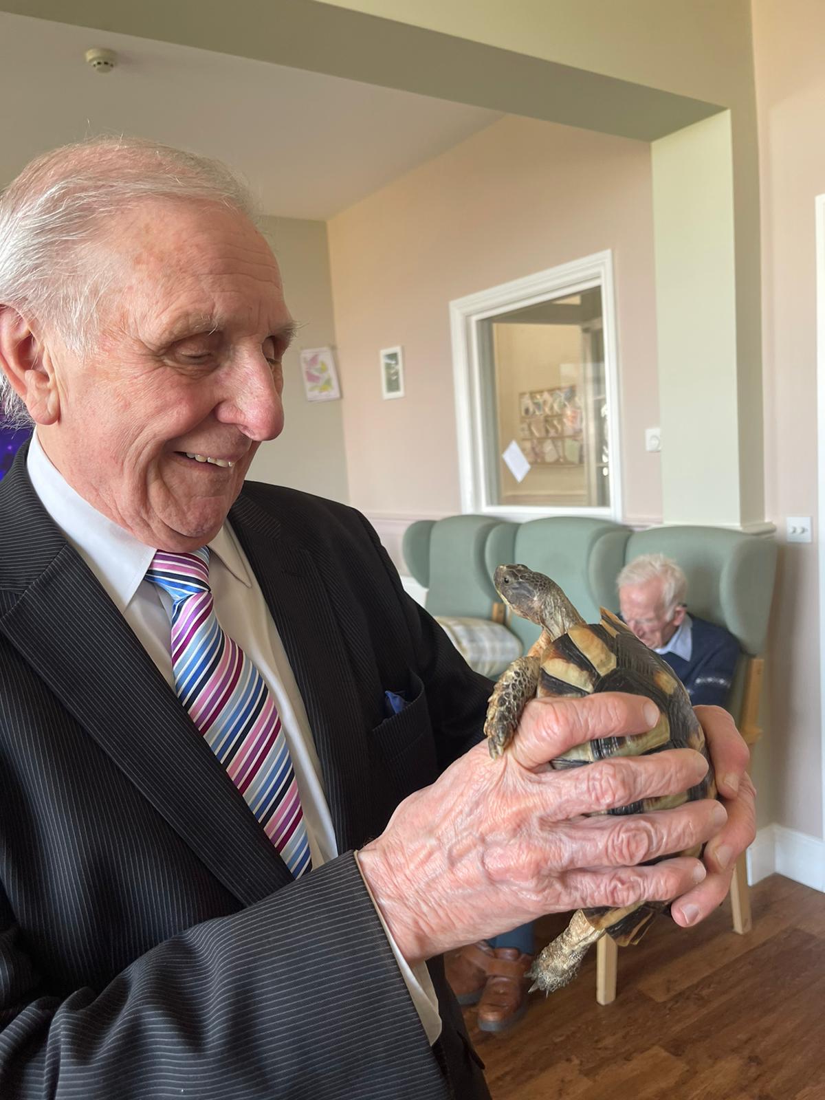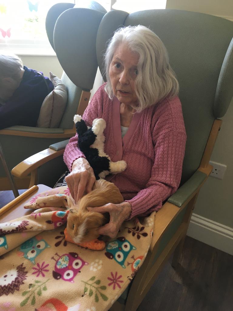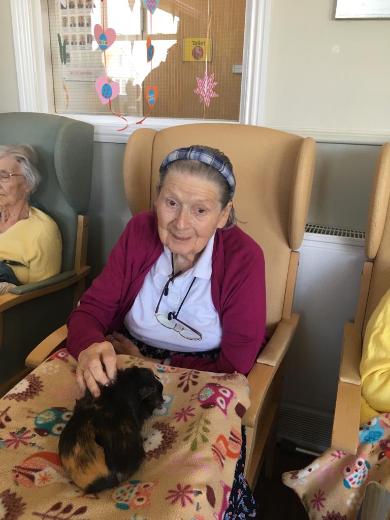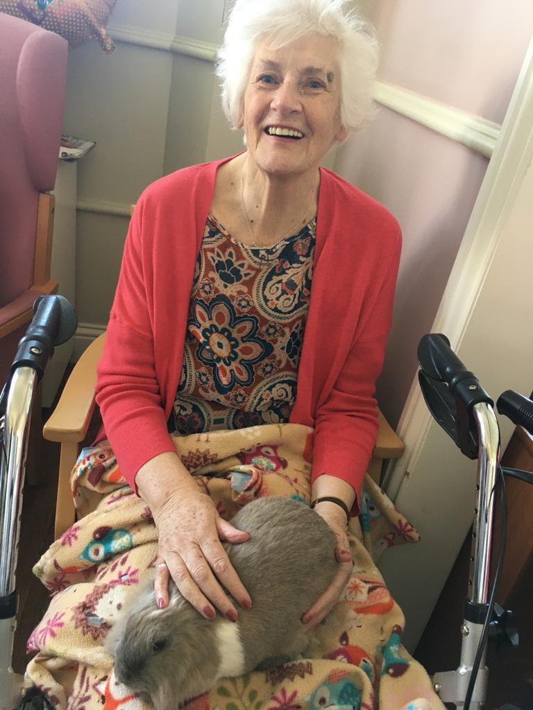 I will start with a bang and talk about the amazing visit we had with the animals on Wednesday. You might have seen some photos already? We had it all: dogs, snakes, tortoise, chihuahua, rabbits, bearded dragon and the rest!! The lovely pets brought so much fun, excitement and love to our lovely residents who could not stop laughing. Even our members of staff joined it – what a fabulous afternoon it was and we will book them again within the month! The lovely touch was that some of the pets were able to visit our residents in their room.