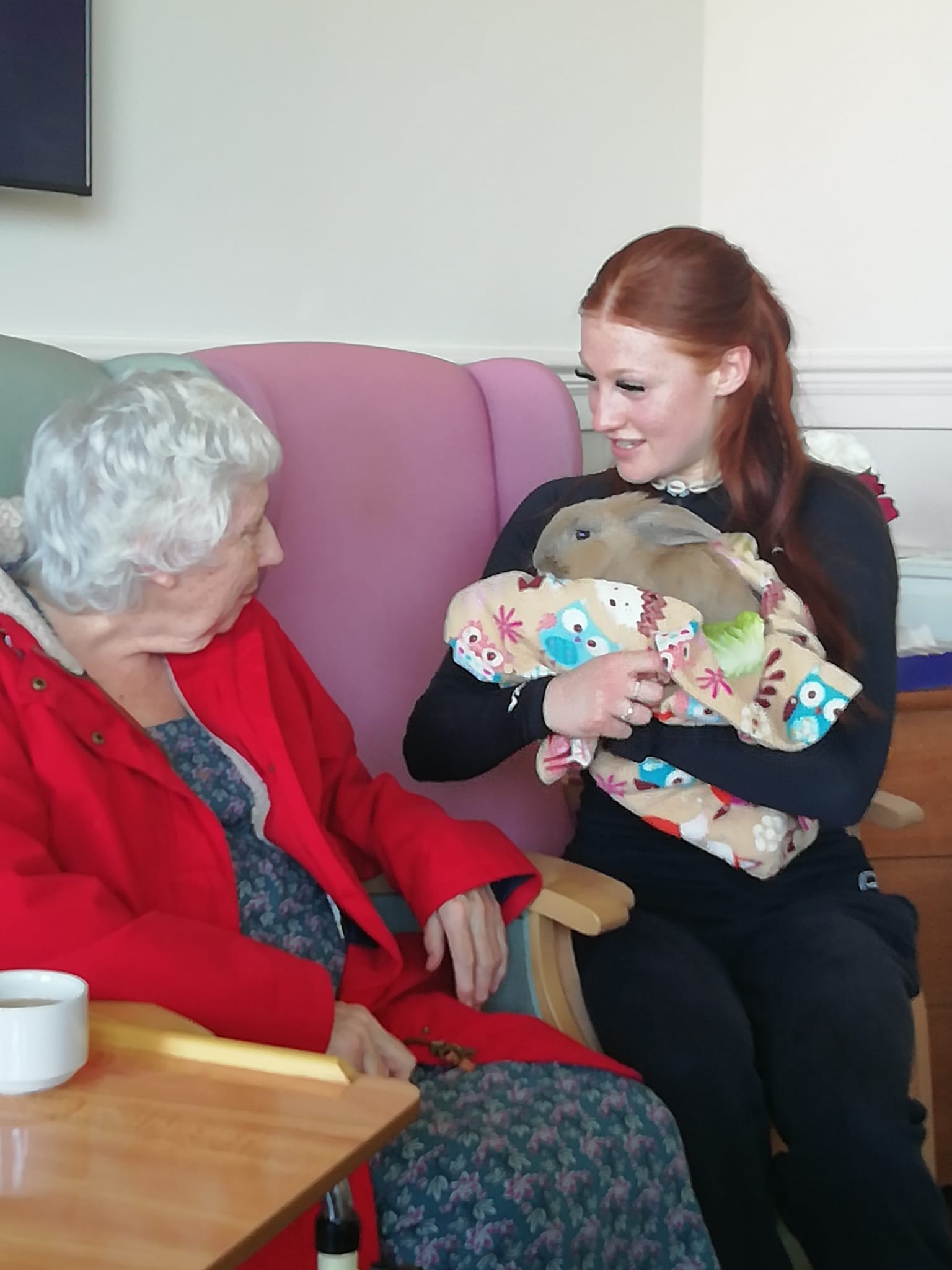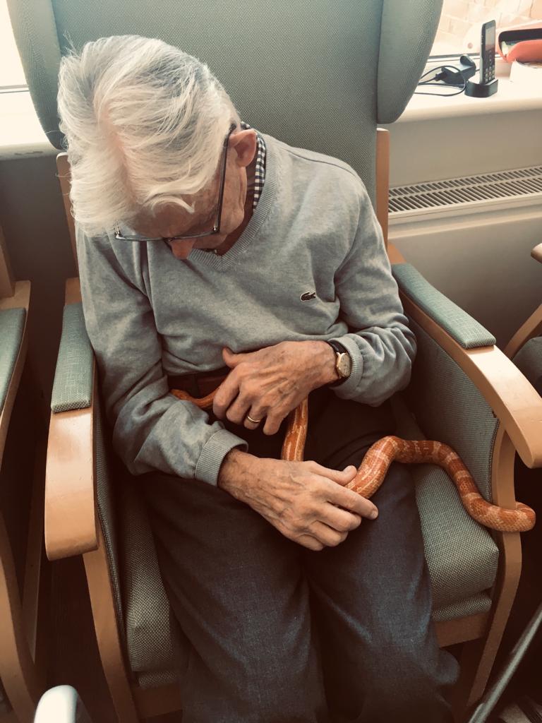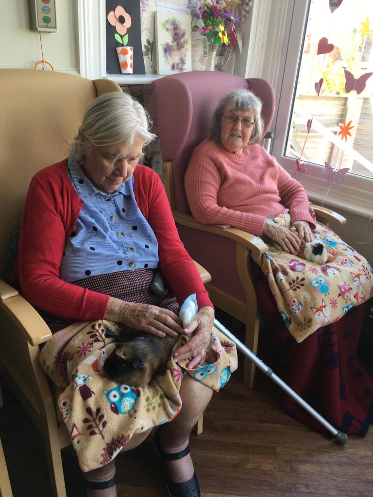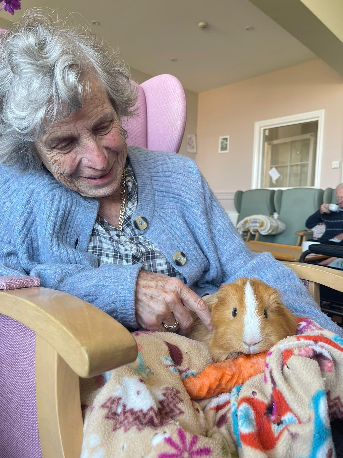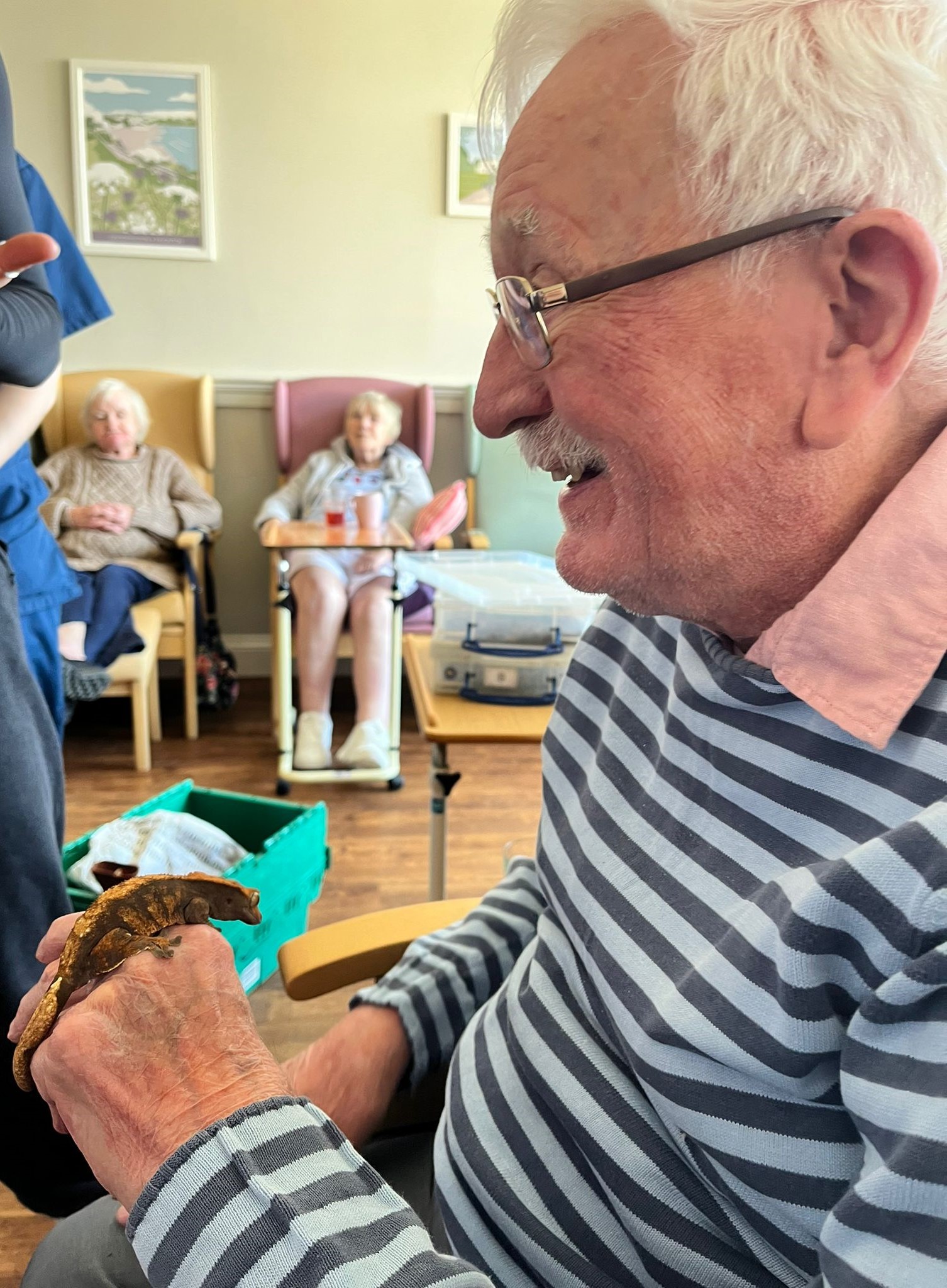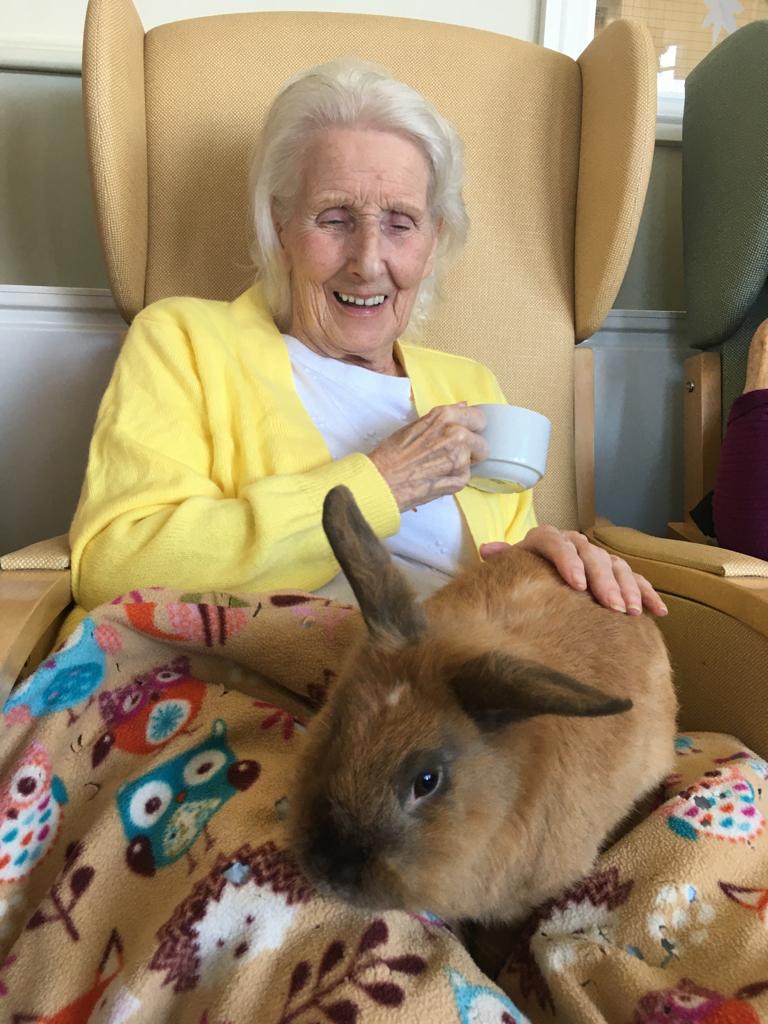 I will start with a bang and talk about the amazing visit we had with the animals on Wednesday. You might have seen some photos already? We had it all: dogs, snakes, tortoise, chihuahua, rabbits, bearded dragon and the rest!! The lovely pets brought so much fun, excitement and love to our lovely residents who could not stop laughing. Even our members of staff joined it – what a fabulous afternoon it was and we will book them again within the month! The lovely touch was that some of the pets were able to visit our residents in their room.